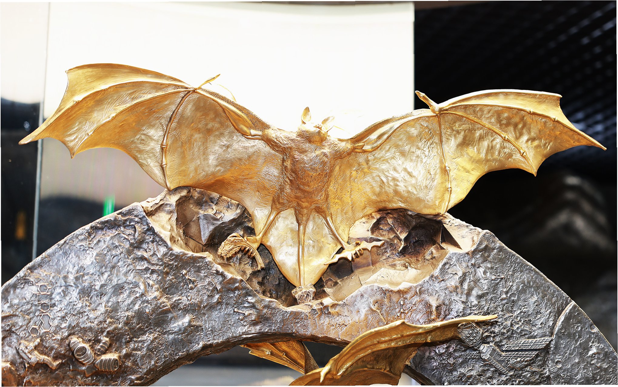 순금 162㎏과 은 281㎏을 사용해 제작된 황금박쥐상은 네 마리의 황금박쥐가 역동적으로 날아가는 모습을 형상화하고 있습니다. 특히 함평 지역에 서식하며 복을 가져다준다는 실제 황금박쥐의 스토리를 담아내, 단순한 금·은 조형물을 넘어 함평의 생태적 가치를 담아낸 상징적인 자산으로 재평가받고 있습니다. 당시 제작비로 약 27억원이 투입되었으나, 관광객 유치 효과가 미미하다는 비판으로 '예산 낭비' 논란에 휩싸이기도 했습니다.