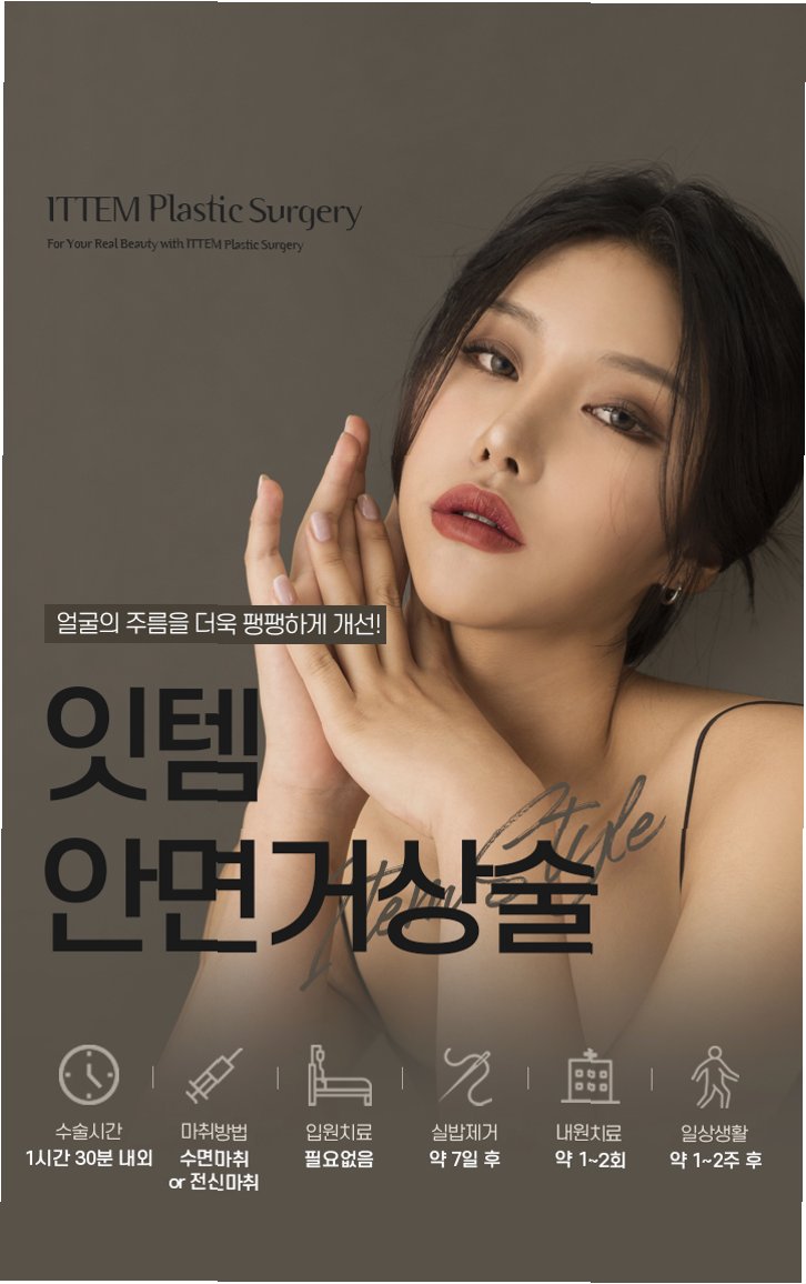 안면거상술은 노화로 인해 처진 얼굴과 목의 피부 및 근막층을 함께 당겨 주름과 늘어짐을 효과적으로 개선하는 대표적인 안티에이징 시술입니다. 단순히 피부 표면만 당기는 것이 아니라, 피부 아래 깊은 층까지 리프팅하여 더욱 자연스럽고 오랜 기간 지속되는 효과를 자랑합니다. 수술은 미니 리프트, 풀 페이스리프트, 목 거상 등 다양한 방식으로 진행되며, 귀 주변을 절개하여 피부와 조직을 당긴 후 여분의 피부를 제거하는 방식으로 이루어집니다. 수술 시간은 범위에 따라 3~6시간 정도 소요될 수 있으며, 회복 기간은 붓기와 멍이 2~3주, 일상 복귀는 1~2주, 자연스러워지기까지는 1~3개월 정도 예상됩니다. 개인차가 있지만 일반적으로 5~10년 정도 효과가 유지됩니다.